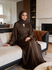 Abaya élégante couleur chocolat avec de délicats accents dorés