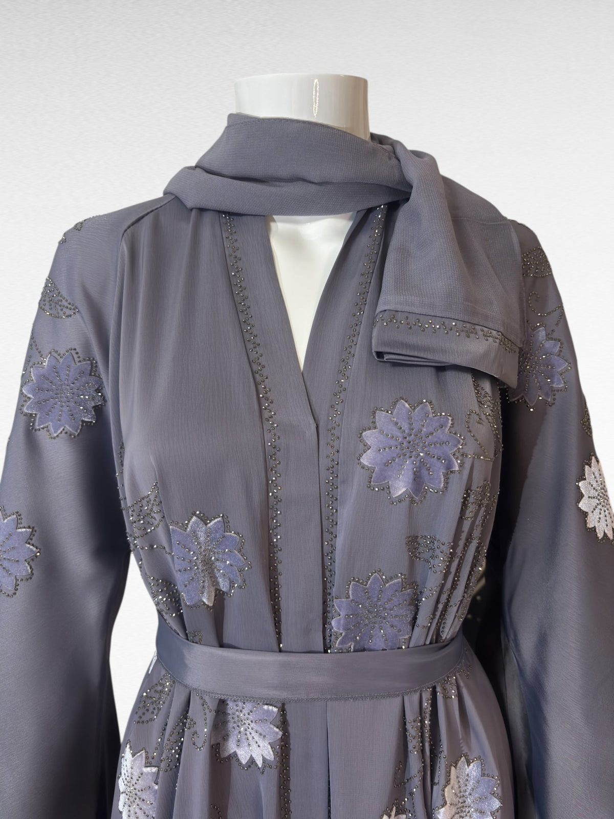 Abaya grise exquise ornée de broderies florales - 56 (M)
